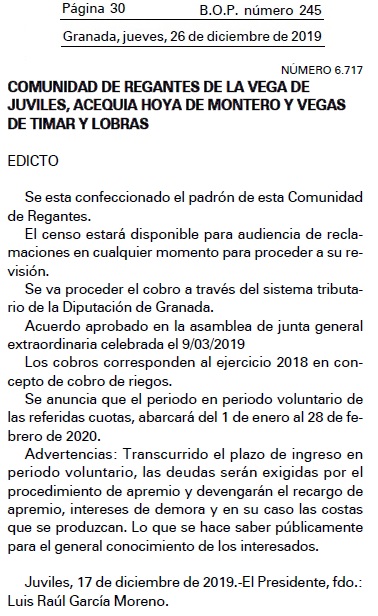 Canon 2018 BOP numero 245, pagina 30, Granada, jueves, 26 de diciembre de 2019. Cobros periodo voluntario.