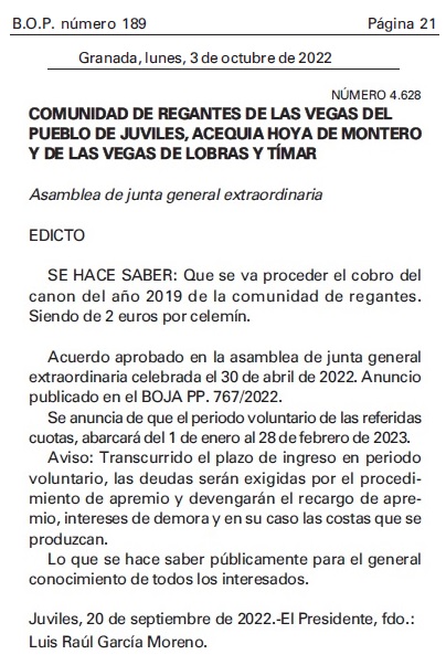 Canon 2019 BOP numero 189, pagina 21, Granada, lunes, 3 de octubre de 2022. Cobros periodo voluntario.