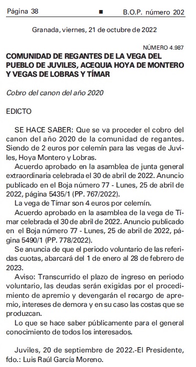 Canon 2020 BOP numero 202, pagina 38, Granada, viernes, 21 de octubre de 2022. Cobros periodo voluntario.