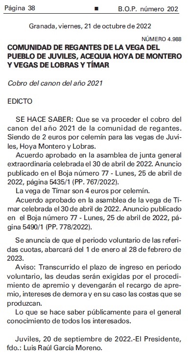 Canon 2021 BOP numero 202, pagina 38, Granada, viernes, 21 de octubre de 2022. Cobros periodo voluntario.